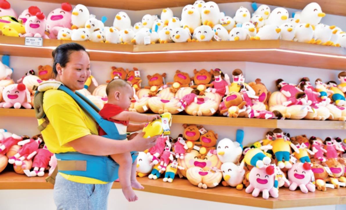 ▲哈舅大本營眾多毛絨玩具吸引游客駐足。(韓永奎 攝)