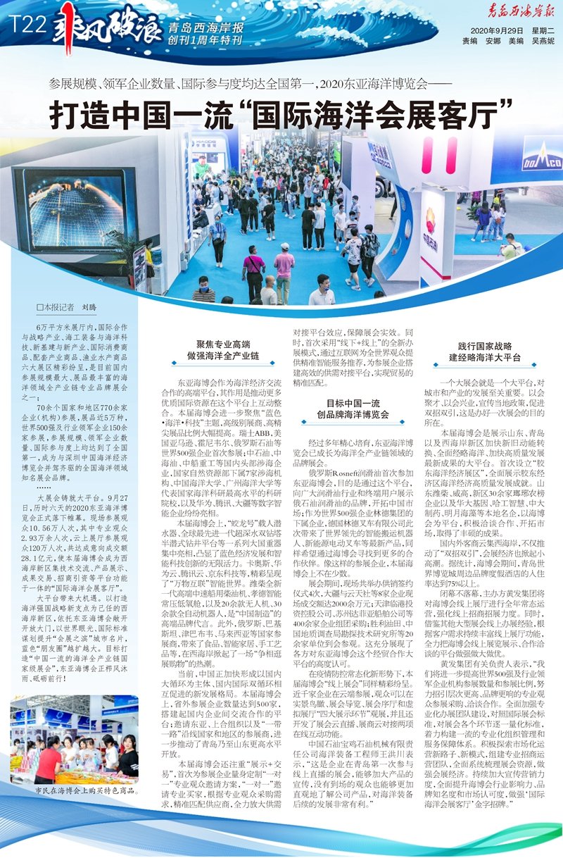 大展會(huì)鑄就大平臺(tái)。9月27日,歷時(shí)六天的2020東亞海洋博覽會(huì)正式落下帷幕?,F(xiàn)場參展觀眾10.56萬人次,其中專業(yè)觀眾2.93萬余人次,云上展廳參展觀眾120萬人次,共達(dá)成意向成交額28.1億元,使本屆海博會(huì)成為西海岸新區(qū)集技術(shù)交流、產(chǎn)品展示、成果交易、招商引資等平臺(tái)功能于一體的“國際海洋會(huì)展客廳”。
