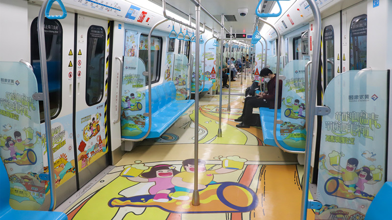 “地鐵專列利用車廂的立體空間,以插畫手繪風(fēng)為主要設(shè)計(jì)風(fēng)格,將金沙灘啤酒城IP形象——‘哈舅’作為靈魂人物,帶領(lǐng)乘客穿梭于六大主題車廂間,共同感受新區(qū)魅力,打造了場(chǎng)景化的品牌營(yíng)銷,帶給乘客沉浸式體驗(yàn)?!秉S發(fā)集團(tuán)策劃部工作人員趙益弘介紹。