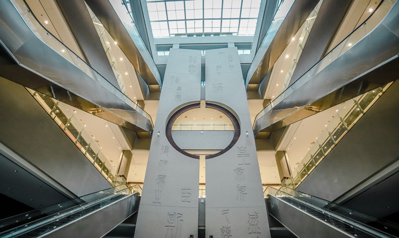 從空中俯覽,博物館、圖書館、科技館三個文化場館呈品字布局,之間有數(shù)條連廊貫通,既相互獨(dú)立,又渾然一體。博物館外立面設(shè)計端莊大氣,極具歷史人文氣息;圖書館一處紅色外立面采用剪紙藝術(shù)設(shè)計而成,十分搶眼;科技館運(yùn)用線條和凹凸變化,將科幻元素巧妙融入建筑之中。