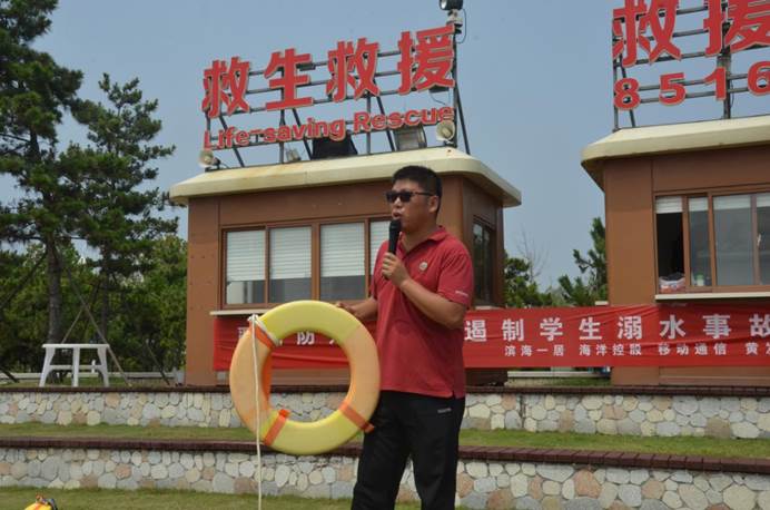 黃發(fā)集團旅游公司副總經(jīng)理傅元彩講解浴場現(xiàn)場游玩注意事項